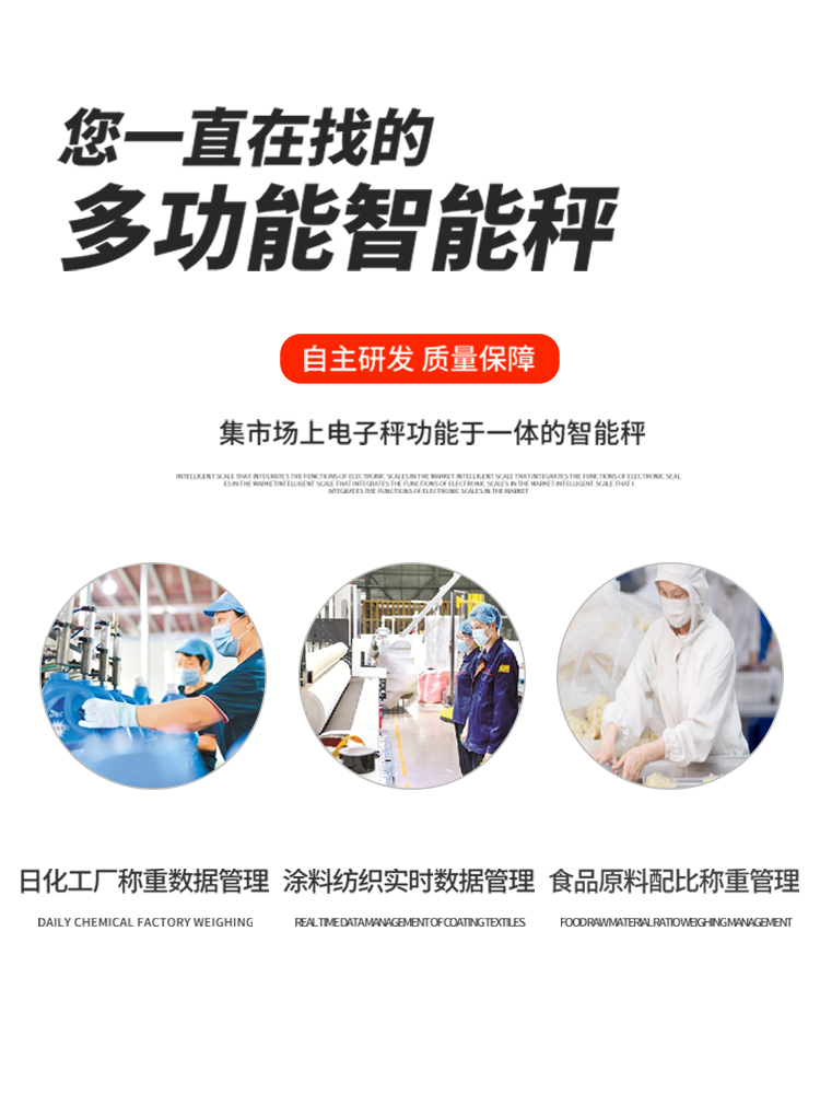 配方精确管理: 在食品、化工、医药等行业,智能秤可存储和调用配方,引导操作员逐步投料,并通过防错报警(上下限报警)确保每种成分的添加量都精确无误,保障产品成分、口感和质量的稳定性。